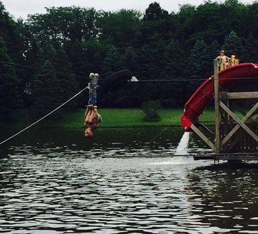 The Cable Ride, aka "The Zipline," is a thrill for anyone who has the courage to ride the line! Perched 10ft in the air, the line takes you for a quick ride across the water. This fun ride is safe and fun for kids and adults of all sizes! This ride is for strong swimmers only as the ride ends in deep water and requires a short swim to a pier.